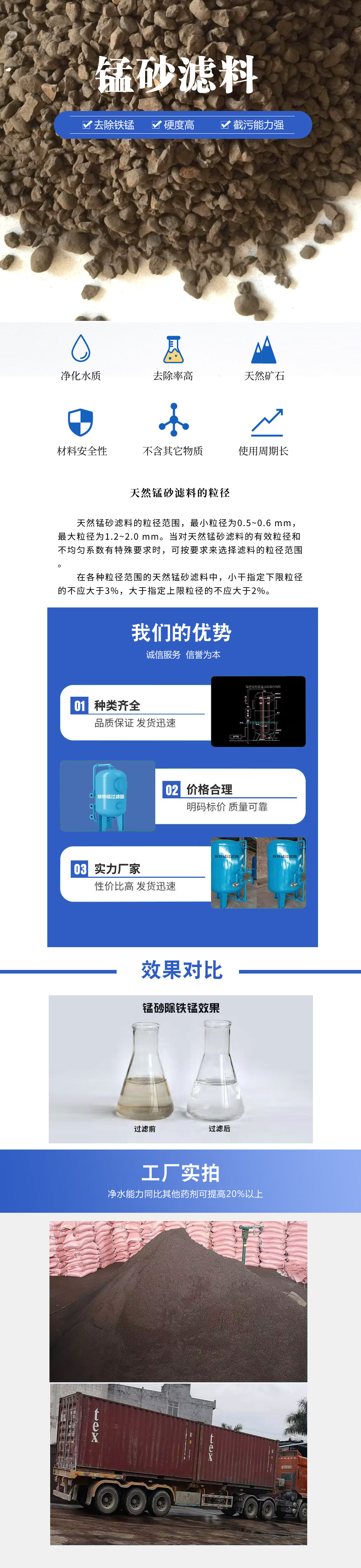 錳砂濾料以錳礦石為原料,經(jīng)破碎、篩分等加工而成。外觀粗糙呈褐色或淡灰色,常用于生活飲用水的除鐵、除錳過(guò)濾裝置,濾水效果非常良好。(注:MnO2≥35%既可除鐵,又能除錳,MnO2≤30%)只能用于地下水除鐵)錳砂濾料是一種地下水處理濾料,外觀黑褐色,近圓形,主要成份是二氧化錳,含量在35%-45%之間。